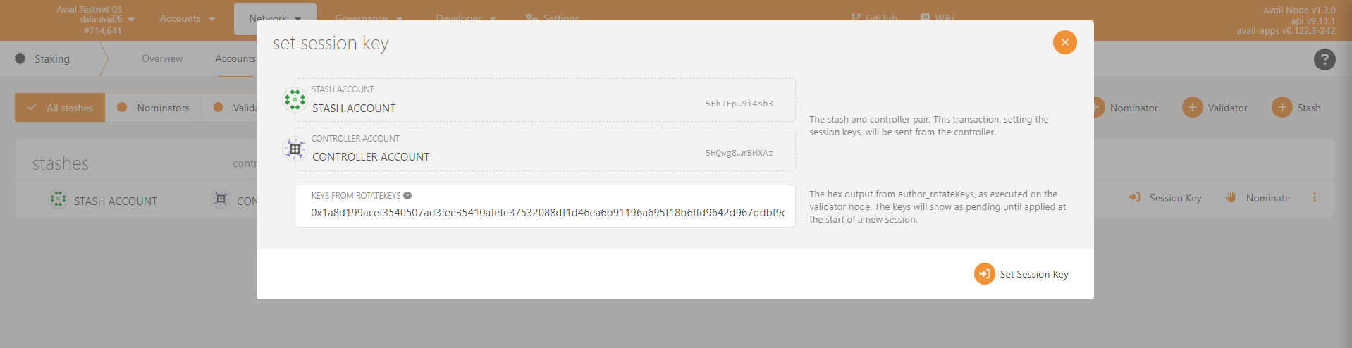curl -H "Content-Type: application/json" -d '{"id":1, "jsonrpc":"2.0", "method": "author_rotateKeys", "params":[]}' http://localhost:9944sudo systemctl restart availd.service